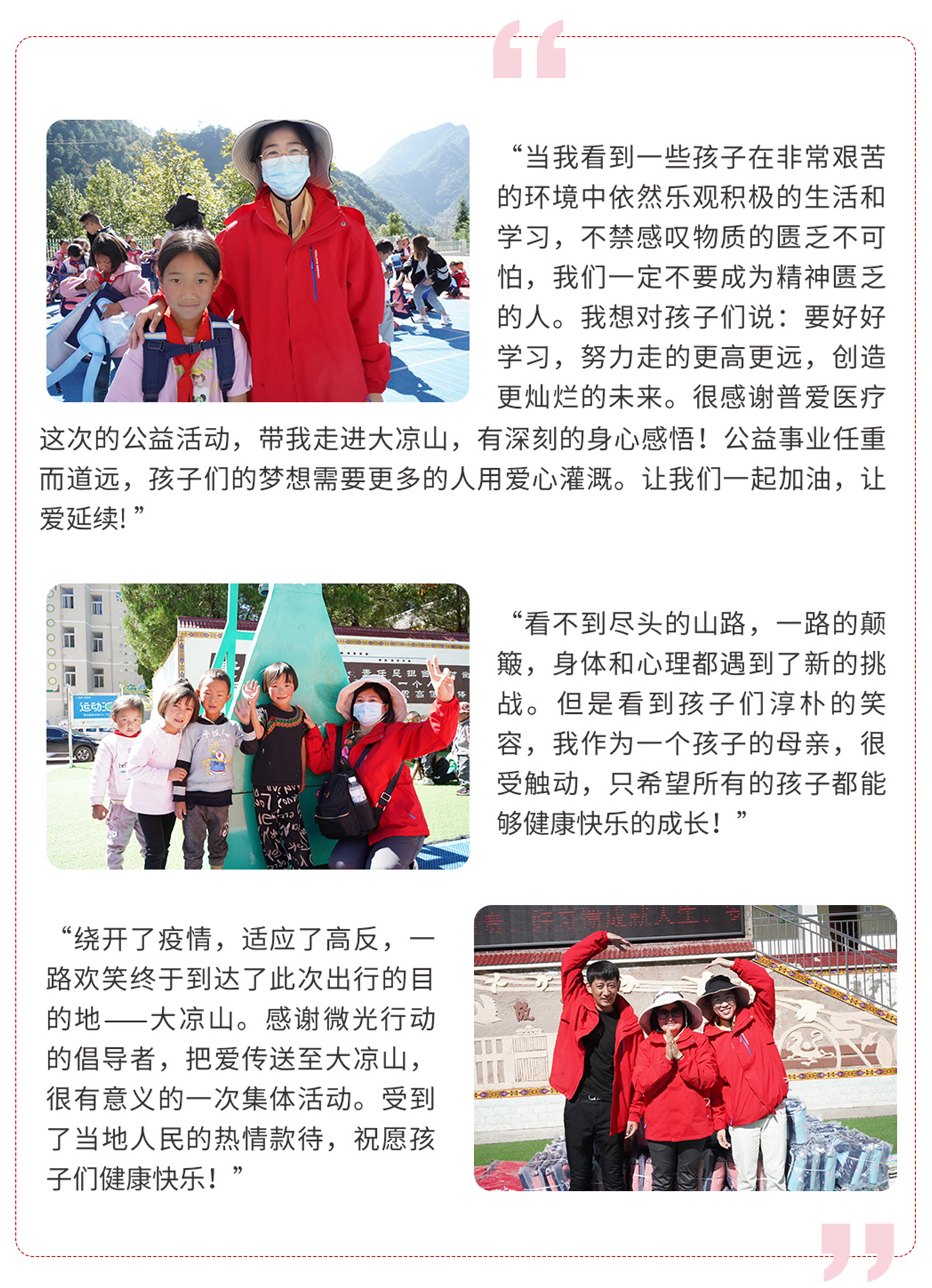 合抱之木,生于毫末;九層之臺,起于累土;踐行公益,永不止步。孩子們開心的笑臉,果農(nóng)們真摯的感謝是普愛醫(yī)療繼續(xù)前行的動力!小小的善舉不僅可以幫助別人,也可以實現(xiàn)自我的價值。讓涓滴之水成為海洋,顆顆愛心變成希望,普愛醫(yī)療“微光行動”,一直在路上!