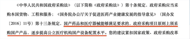 《國務院辦公廳關于促進醫(yī)藥產業(yè)健康發(fā)展的指導意見》中規(guī)定,國產藥品和醫(yī)療器械能夠滿足要求的,政府采購項目原則上須采購國產產品。